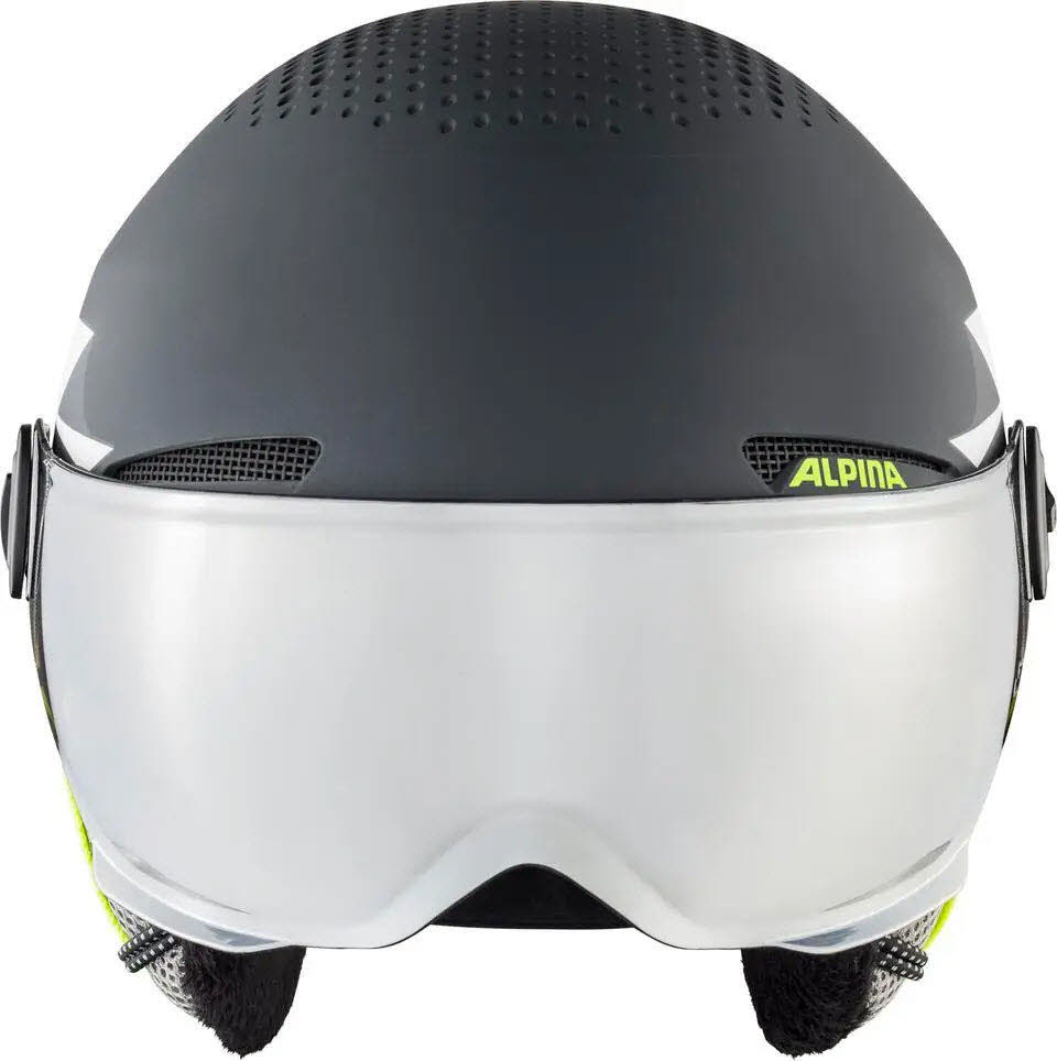 Für den Schutz der Augen sorgt ein nahtlos abschließendes Visier. Die Scheibe ist leicht verspiegelt, bruchfest, bietet 100% UV Schutz und schützt auch vor Zugluft. Weitere Vorteile des Visiers: einfache Handhabung für Kinder, unter dem Visier kann eine optische Brille getragen werden, immer ein perfekter Sitz von Helm und Visier, es kann keine Goggle vergessen oder verloren werden.
