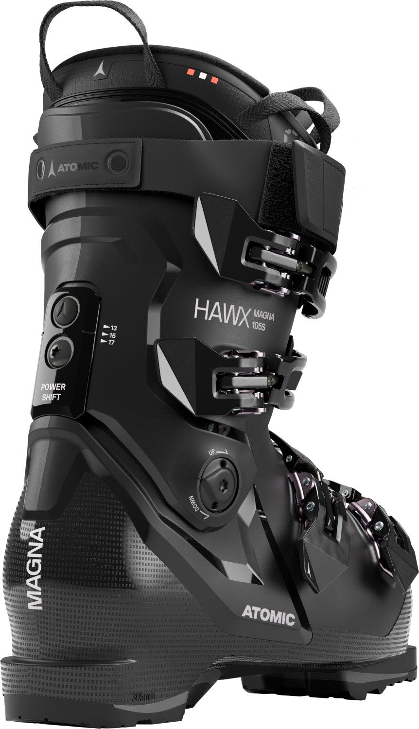 Der leistungsstarke Atomic Hawx Magna 105 S W bietet Komfort und Präzision in einem. Er hat einen breiten 102mm-Leisten und harten 105er-Flex und ist damit der steifste Alpinskischuh aus der Hawx Magna W Serie für All-Mountain-Skifahrerinnen mit breiteren Füßen. Die Prolite Konstruktion sorgt mit Verstärkungen an den entscheidenden Stellen der Schale und Manschette für Stabilität und damit kraftvolle Performance, mit Power Shift lassen sich Vorlagewinkel und Flex verstellen. Sein Mimic Gold Innenschuh mit Ankle Lock ist im Bereich von Ferse und Knöchel vorgeformt und kann per Thermoanpassung auf die Fußform abgestimmt werden, mit Memory Fit lassen sich auch die Schale und Manschette individuell formen. Im Vergleich zu den Unisex-Modellen hat dieser Skischuh eine weitere und auf der Rückseite niedrigere Manschette, damit er unterschiedlichen Waden passt. Und wer hier noch mehr Platz braucht, entfernt einfach den Spoiler der anpassbaren Manschettenkonstruktion (AFS).