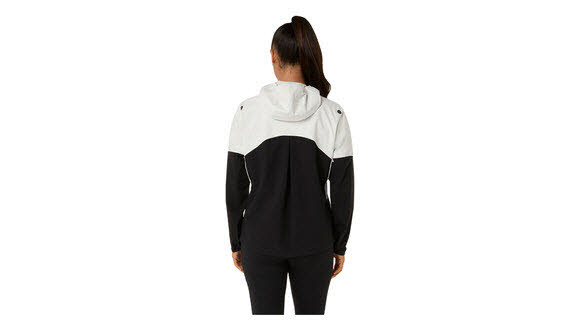 Die Jacke wurde für Läufe bei jedem Wetter entwickelt und bietet Schutz vor Nässe. Sie verfügt über eine verstellbare Kapuze mit integriertem Schirm, die einen sicheren Sitz gewährleisten und Ablenkungen beim Laufen minimieren.
