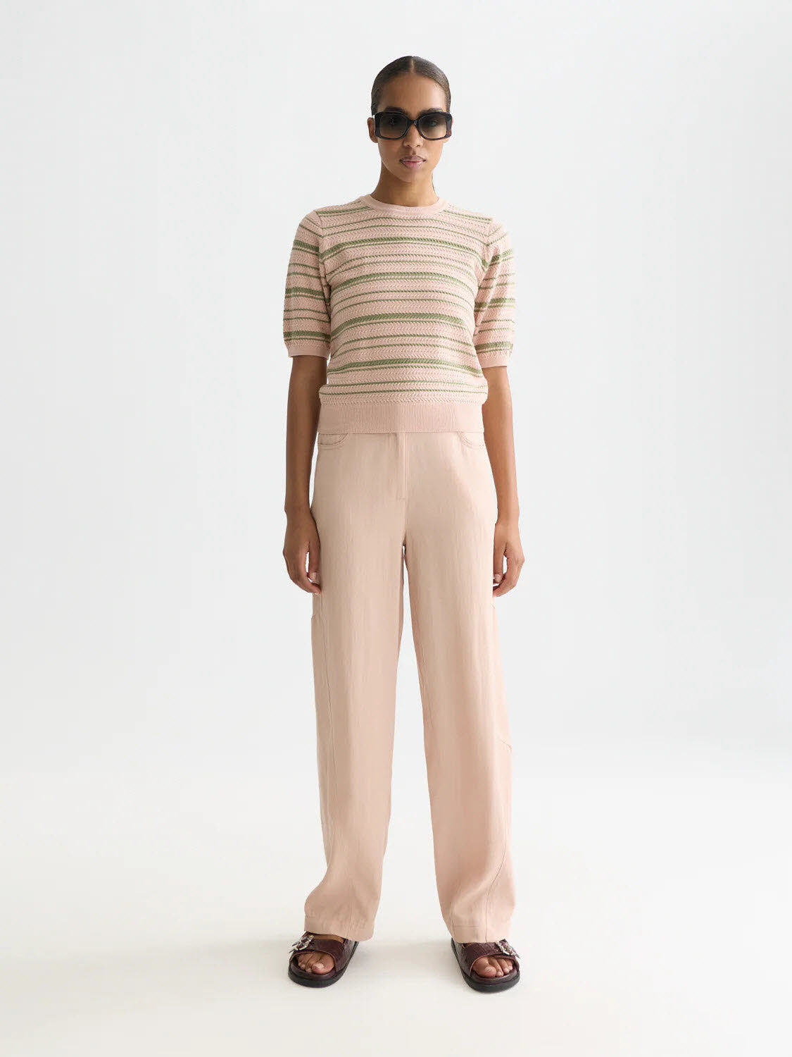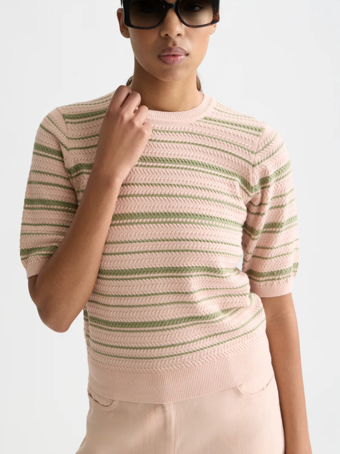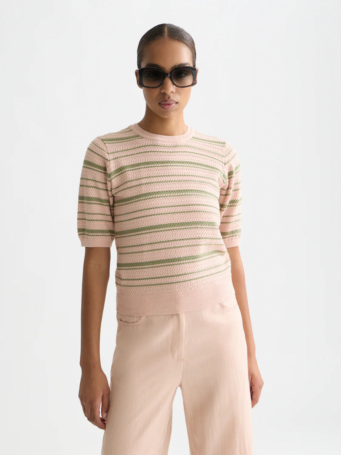 A textured stripe knitted top with refined striped design, offering a polished, contemporary feel.